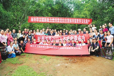 在景迈山古茶林,海外华文媒体代表共同签字留念助力申遗成功。