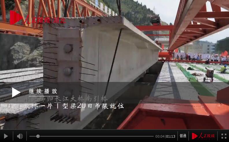 人民网秭归7月22日电 20日下午3点18分,秭归长江大桥(原名香溪长江大桥)南引桥最后一片丅型梁吊装就位,标志着目前世界最大跨度钢箱桁架推力式拱桥全线贯通。