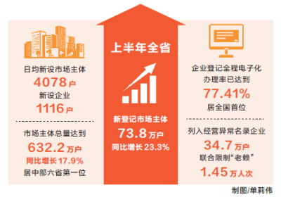 本报讯(记者孙静通讯员鞠海生陆诗秦)营商环境提升持续激发市场活力。7月22日,省市场监督管理局发布数据显示,今年上半年,全省新登记市场主体73.8万户,同比增长23.3%;日均新设市场主体4078户、新设企业1116户。截至6月底,全省市场主体总量达到632.2万户,同比增长17.9%,占全国总量的5.5%,居全国第五位、中部六省第一位。