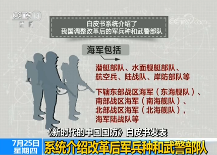 央视网消息:新版白皮书系统介绍了我国调整改革后的军兵种和武警部队。其中陆军包括机动作战部队、边海防部队、警卫警备部队等,下辖5个战区陆军、新疆军区、西藏军区等。