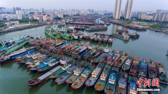 资料图:航拍在海口新海港码头靠岸停泊的船只连成一片。 骆云飞 摄