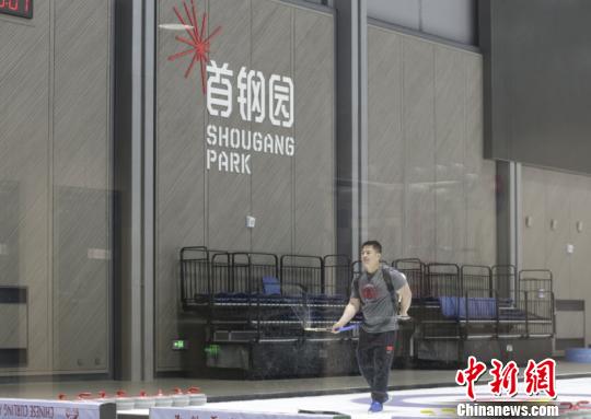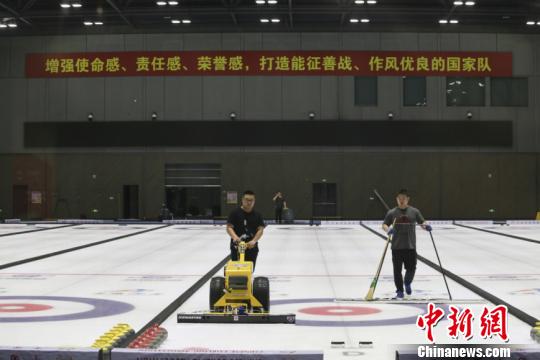 在北京首钢园国家冬季运动训练中心冰壶馆训练内,制冰师正在维护冰面。 贾天勇 摄