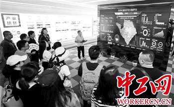 图为讲解员正通过扶贫开发大数据平台为来访者介绍当地脱贫情况。