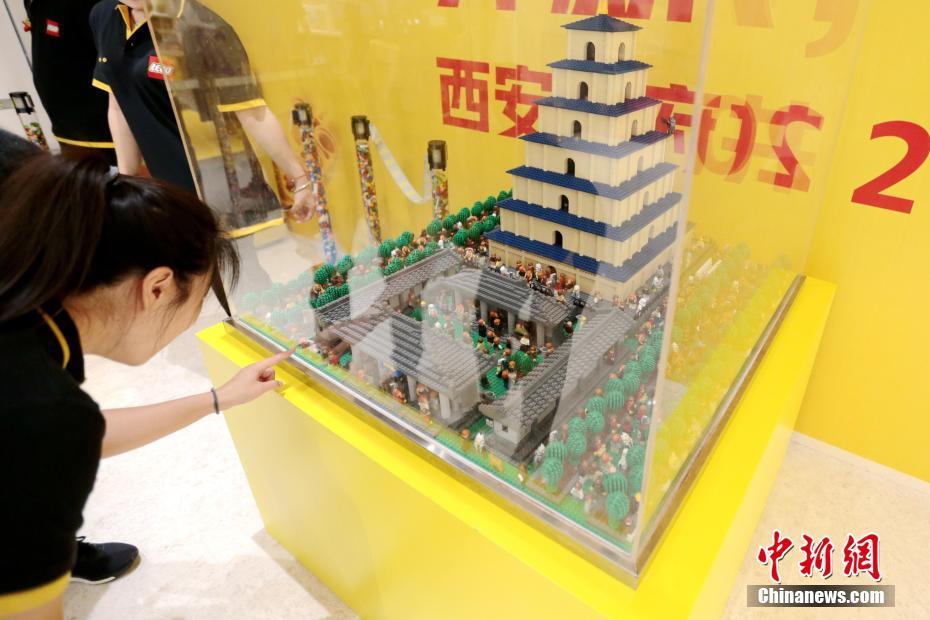 8月5日,一座由10万余块乐高积木拼出的“大雁塔”吸引顾客。近日,西北地区首家乐高授权专卖店在西安南门外正式开业,由乐高积木搭建而成的大雁塔、钟楼等亮相该家零售店。中新社记者 张远 摄