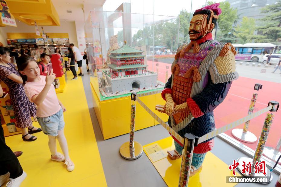 8月5日,一尊由乐高积木拼出的“真彩兵马俑”吸引顾客。近日,西北地区首家乐高授权专卖店在西安南门外正式开业,由乐高积木搭建而成的大雁塔、钟楼等亮相该家零售店。此外,店内展出两尊高达1.9米、重165公斤、各由5.6万块乐高积木拼搭而成的彩色兵马俑,吸引了不少市民和游客前来参观拍照。中新社记者 张远 摄