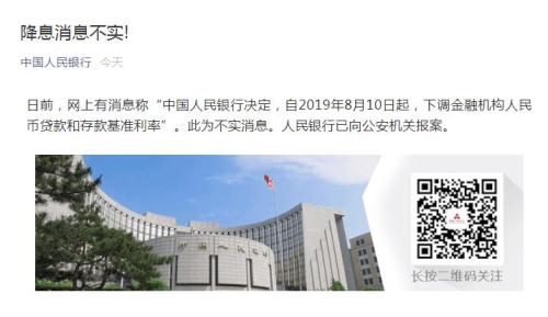 中新网8月7日电 据中国人民银行微信公众号7日消息,日前,网上有消息称“中国人民银行决定,自2019年8月10日起,下调金融机构人民币贷款和存款基准利率”。此为不实消息。人民银行已向公安机关报案。