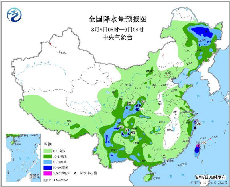 预计,8月8日8时至9日8时,黑龙江中南部、甘肃南部、陕西南部、西南地区北部和东部、云南北部和东部、广西西部、浙江东部、台湾岛等地的部分地区有大雨或暴雨,其中台湾岛北部局地有大暴雨(100~160毫米)。为此,中央气象台8月8日6时继续发布暴雨预报(见图2)。