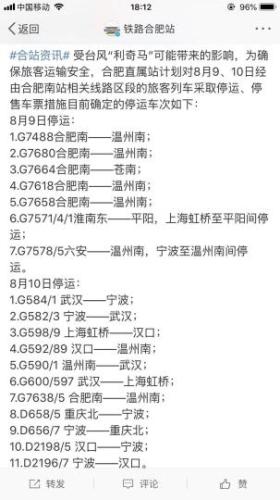 针对今年第9号台风“利奇马”可能带来的影响,为确保旅客运输安全,合肥站和合肥南站计划对8月9日、10日、11日经由合肥火车站相关线路区段的旅客列车采取停运、停售车票措施。其中,8月10日停运的车次有:G584/1 武汉——宁波;G582/3 宁波——武汉;G598/9 上海虹桥——汉口;G592/89 汉口——温州南;G590/1 温州南——武汉;G600/597 武汉——上海虹桥;G7638/5 合肥南——温州南;D658/5 重庆北——宁波;D656/7 宁波——重庆北;D2198/5 汉口——宁波;D2196/7 宁波——汉口。