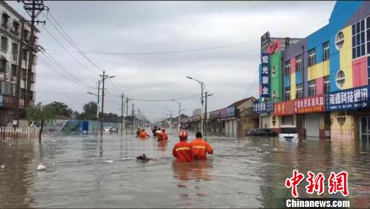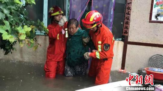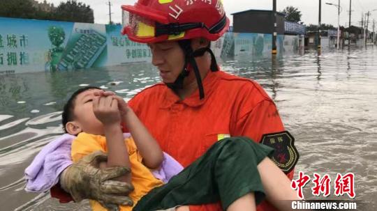 山东省聊城市高唐县消防救援大队队员冒雨转移安置受困人员。 张万福 摄