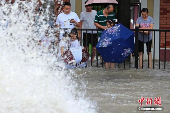 8月10日,上海北华路出现严重积水,市民路边看“海”。上海中心气象台于当日14时20分更新暴雨黄色预警信号为暴雨橙色预警信号。中新社记者 殷立勤 摄