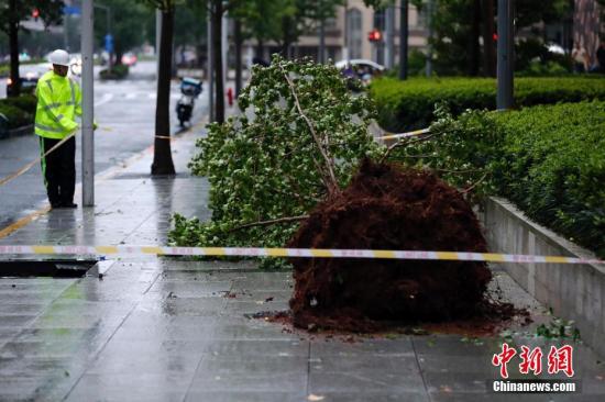 8月10日,街头的一棵行道树被台风“利奇马”连根拔起。中新社记者 汤彦俊 摄