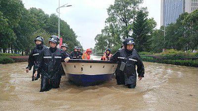 受“利奇马”影响浙江临海发生内涝 民警用冲锋舟救援