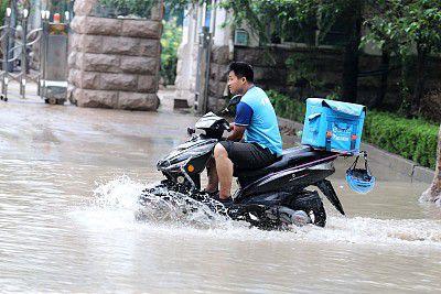 受“利奇马”影响山东潍坊普降大雨 市民在道路积水中前行