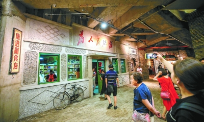 从王府井百货大楼乘坐扶梯到地下二层,映入眼帘的是青瓦石砖堆砌起的围墙。“卤煮炒肝爆肚,豆汁焦圈炸酱面来一碗吧您嘞!”往东边走便是休息用餐的和平小吃街,北京的特色小吃陈列一排,售货员们身着上世纪的服装,木桌木椅、木盘木碗颇有年代气息。北面是3家富有年代气息的老店,邮戳、副食铁盒、古玩首饰承载一代北京人的记忆。南边的老照相馆、老药铺、食品店、旧书局里,游客络绎不绝。