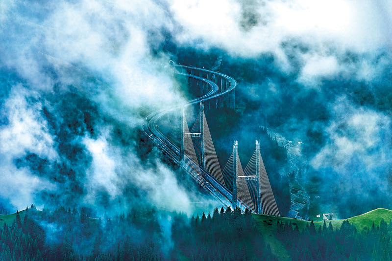 新疆大力实施公路、铁路、民航网络建设,四通八达、陆空纵横的立体交通网加快形成。截至2019年8月初,新疆高速公路里程超过4800公里,所有地州市都迈入高速公路时代。同时,新疆也进入了高铁和地铁时代。图为2017年5月,云山雾绕下的连霍高速公路新疆果子沟大桥段。 新疆维吾尔自治区党委宣传部供图