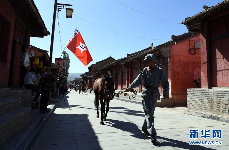 8月16日,一名身穿红军服的少年牵马走在哈达铺镇红军街上。当地群众经常为游客表演再现红军经过哈达铺场景的节目。新华社记者 马宁 摄