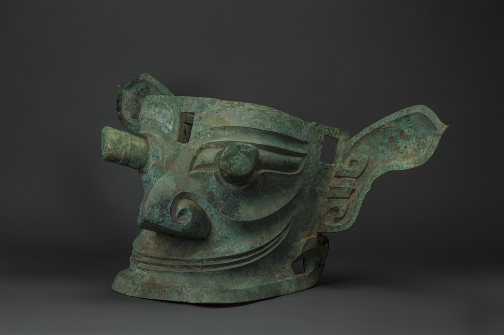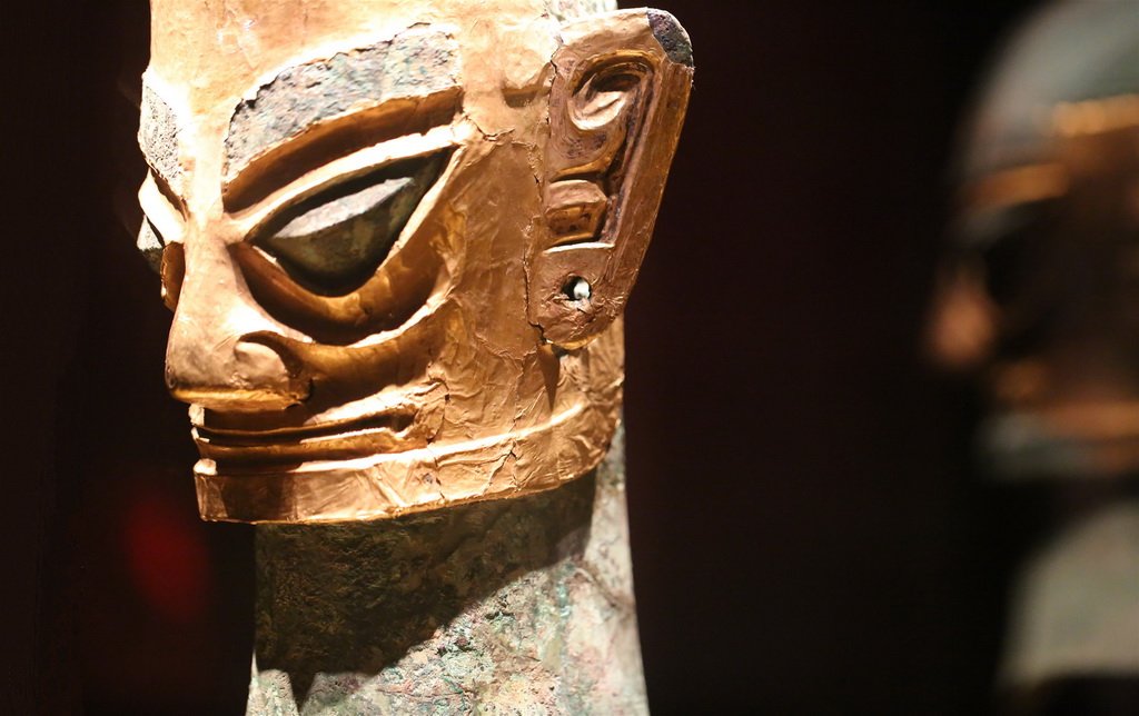 这是贴有黄金面罩的青铜人头像(4月27日摄)。