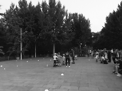 场上练着的,大多是孩子。家长们则自发围成大大小小的圈子,将公园北门内的空场分割利用起来。