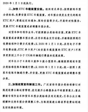 该通知指出,要加快ETC车载装置安装,组织有关单位,按照新的车型分类标准,免费安装ETC车载装置。对车型分类发生变化的既有ETC用户,要通过定向通知、预约安装等方式,开展针对性服务,更换ETC车载装置或者调整车型分类。