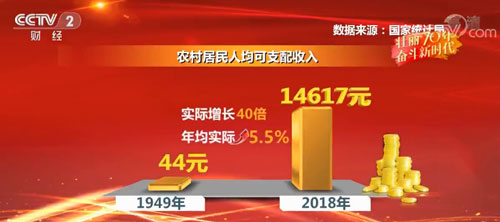 数据显示,2018年农村居民人均可支配收入14617元,扣除物价因素,比1949年实际增长40倍,年均实际增长5.5%。