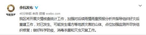 通报指出,余杭区将继续排查危旧房屋、山塘水库、地质灾害点,防止发生次生灾害;转移安置好受灾群众,全力抢修受损道路和电力设施,确保尽快通电通路,恢复生产。