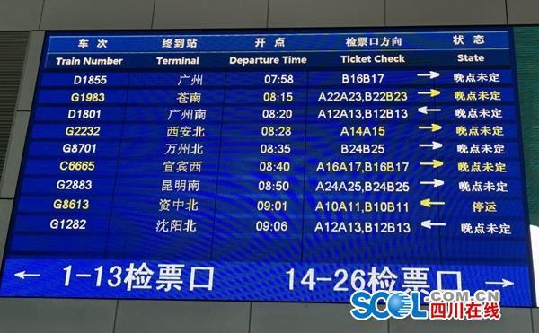 四川在线消息(记者 邵明亮)9月8日8:00,受今晨内江地震影响,成都东站G8541、G8543、G8613等车次列车停运。D1855、G1983、D1801、G2232、G8701、C6665、G2883、G8613、G1282等多趟列车晚点,发车时间未定。