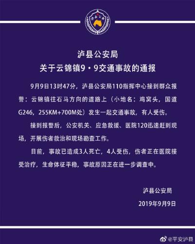 中新网9月10日电 四川省泸州市泸县公安局官方微博10日晚发布通报称,9日,四川泸县G246国道发生一起交通事故,造成3人死亡,4人受伤,事故原因正在调查中。