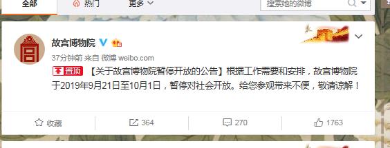 中国网9月11日讯 据故宫博物院官方微博今日消息,根据工作需要和安排,故宫博物院于2019年9月21日至10月1日,暂停对社会开放。