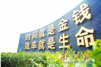 位于深圳南山蛇口时间广场的“时间就是金钱,效率就是生命”的标语牌。 南方日报记者 朱洪波 摄
