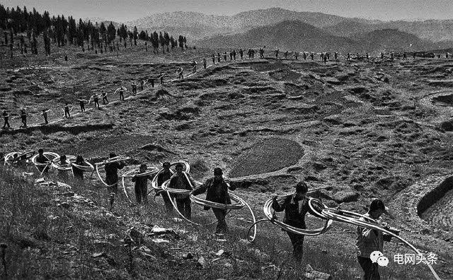 上世纪八十年代,我国山区电力施工架线,一根核桃粗细的输电导线,需要几十人乃至上百人用扁担挑着上山进行施工放线。图为1982年山东省淄博市博山区石门乡龙堂山区架线现场。