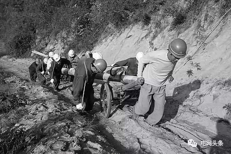 在河南山区,当年供电员工用架子车拉着线杆进山。