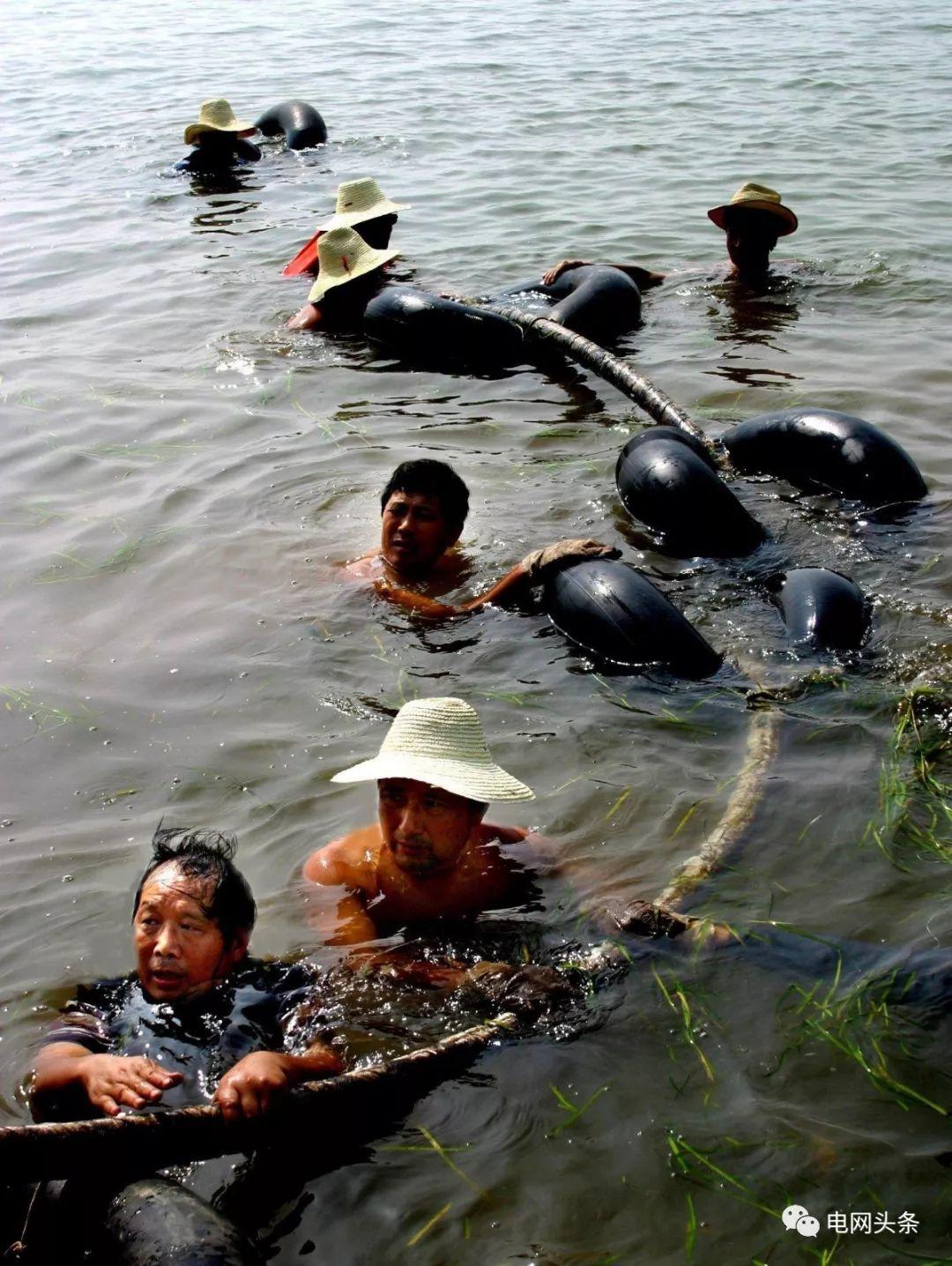 湖北“户户通电”工程现场,供电员工泡在水中敷设深水电缆。