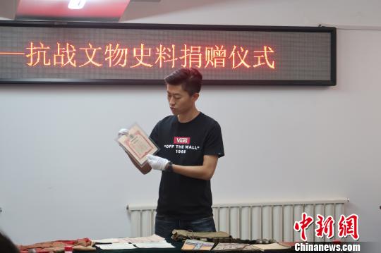 捐赠者介绍所捐抗战文物史料。 韩宏 摄