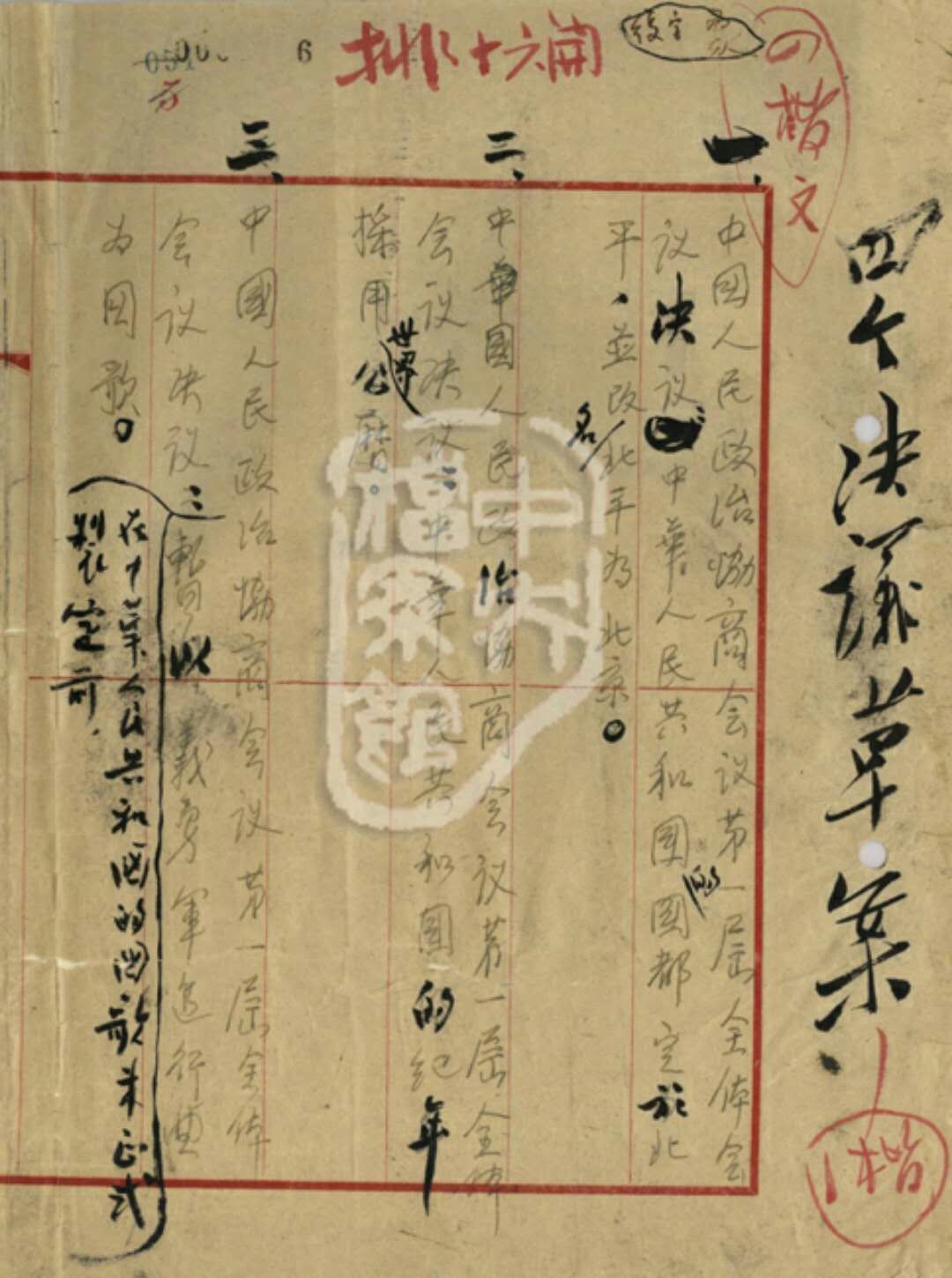 △中国人民政治协商会议第一届全体会议通过的关于国旗、国徽、国歌、国都、纪年的四个决议草案