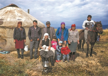 阿勒哈克镇牧业五队的83岁扎黑拉老人全家四代在秋季牧场合影。