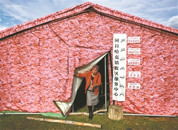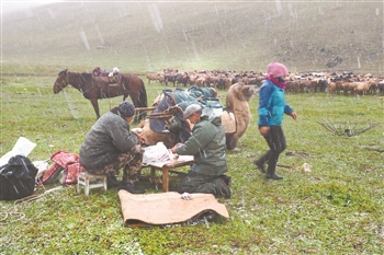 阿勒泰市阿拉哈克镇在托勒海特牧区成立临时服务中心,为转场途中的牧民提供便利。