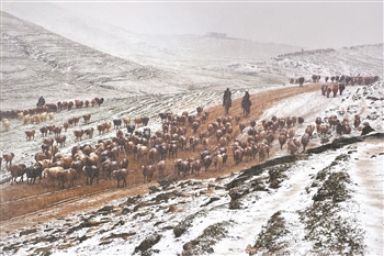 漫长而艰辛的转场路上,牧民们凭着自身单薄的力量,保护着他们的牛羊,和大自然的风霜雨雪做着抗争,当然也要付出代价:经受寒冷、饥饿、劳累的轮番折磨;牛羊冻死、掉膘、流产;对付路上的雪崩、狼群、病痛……长长的牧道,像绳子,一圈一圈,捆住了牧民的心,也捆住了牧民的洒脱豪迈。