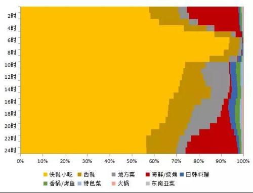 “夜猫子”爱吃啥?主要是快餐小吃、西餐、海鲜烧烤为主,其中西餐品类在夜间消费中的占比较高,但20点之后西餐品类在夜间消费中的占比迅速下降;海鲜烧烤品类在夜间消费中的占比有所提升。