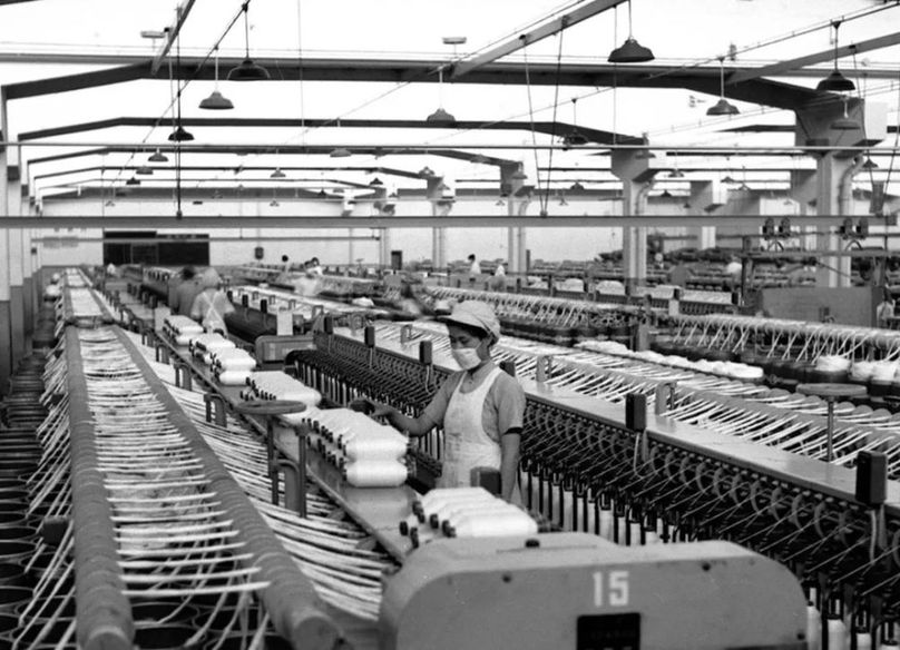 1955年9月16日,北京第二棉纺织厂正式开工生产。这个厂拥有十万纱锭和2400台织布机。这些设备都是中国制造的。(新华社图)