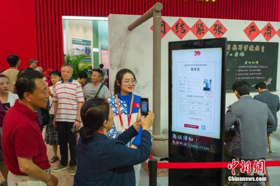 9月24日,“伟大历程 辉煌成就——庆祝中华人民共和国成立70周年大型成就展”在北京展览馆向公众开放。图为参观者体验制作高考“准考证”。 中新社记者 侯宇 摄