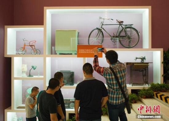 9月24日,“伟大历程 辉煌成就——庆祝中华人民共和国成立70周年大型成就展”在北京展览馆向公众开放。图为参观者在“三转一响”等老物件生活物品展区前拍照。 中新社记者 侯宇 摄