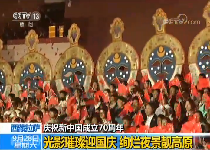 在全世界最大的藏式宫保建筑群——布达拉宫,光束灯投影在白色宫墙上,流动的五角星,拼出了“70”的数字;在广场上,上千人一起跳起“锅庄舞”,祝福新中国成立70周年。