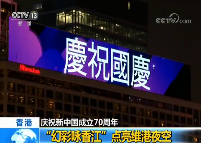 “幻彩咏香江”灯光音乐汇演从2004年起每年都在香港维多利亚港上演。今年,重新编排的“幻彩咏香江”灯光音乐汇演融入了很多与国庆有关的元素,在绚丽的灯光中,“庆祝国庆”、“70”的字样不断呈现。