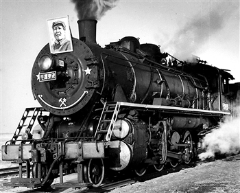一台悬挂着金色毛泽东像的火车头,冲破硝烟、穿越时光,呼啸而来。