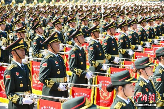 今年10月1日,庆祝中华人民共和国成立70周年大会将在北京天安门广场隆重举行,庆祝大会后将举行盛大的阅兵式和群众游行。国庆阅兵编59个方(梯)队和联合军乐团,总规模约1.5万人,各型飞机160余架、装备580台(套),是近几次阅兵中规模最大的一次。据了解,联合军乐团是整个阅兵过程中入场最早、最后离开的一个方队,要以立正姿态持续站立演奏4个小时左右。成员由来自全军10个大单位的1000余名官兵组成,其中总指挥1名,副总指挥2名,分指挥6名。中新社发 孙晓萌 摄