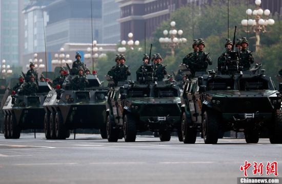 10月1日上午,庆祝中华人民共和国成立70周年大会在北京天安门广场隆重举行。图为三军仪仗队经过观礼台。中新社记者 富田 摄