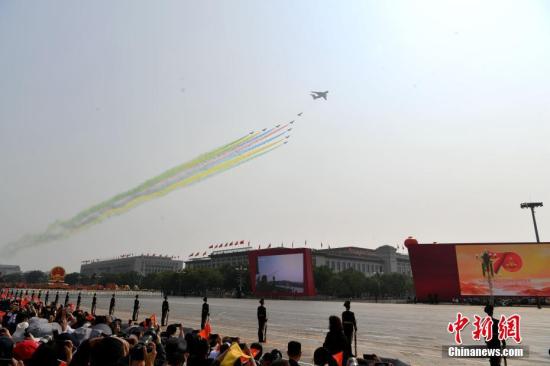 图为领队机梯队飞过天安门广场上空。中新社记者 王东明 摄