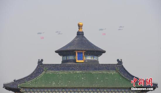 图为接受检阅的空中梯队从天坛祈年殿上空飞过。中新社记者 崔楠 摄