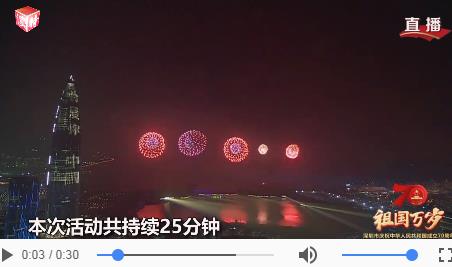 10月1日晚8点,由深圳市委、市政府主办的庆祝中华人民共和国成立70周年大型焰火晚会在深圳湾上演,焰火晚会主题为“祖国万岁”。从四面八方赶来的市民在这里欣赏了一场精彩的焰火晚会。