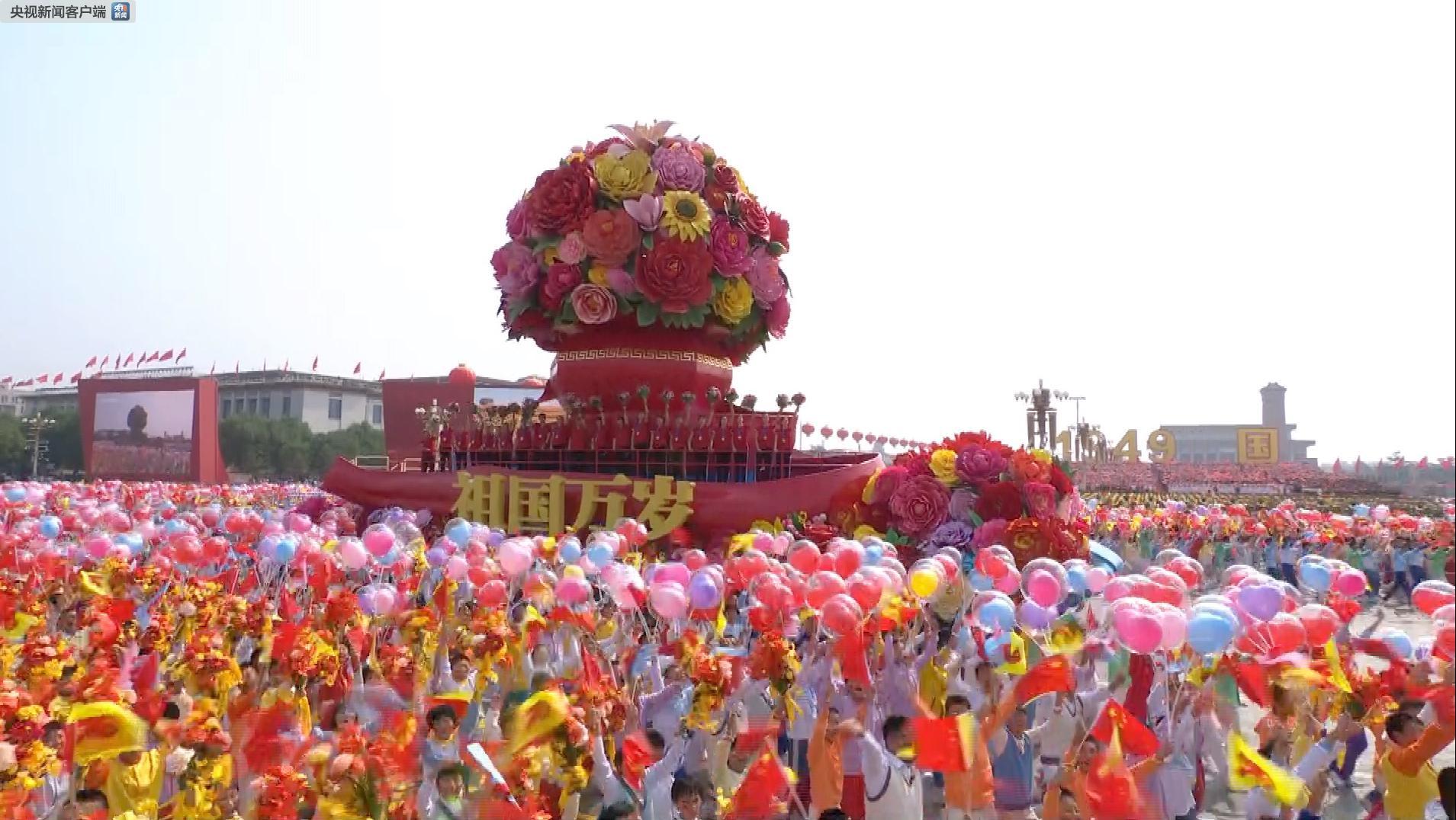 祖国万岁彩车是最后出场的,也是停留时间最长的一辆,要在广场上停留7分钟。彩车的主题是一个大花篮,最大的一朵花直径3米左右,花瓣有8层,花篮中80朵花和花篮下撒落的大大小小300朵花,表达了中华儿女对祖国母亲的衷心祝福和美好祝愿。